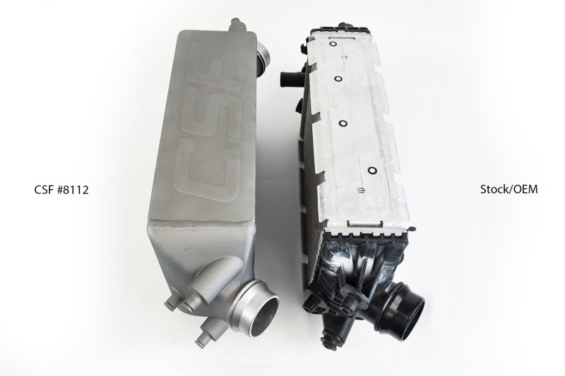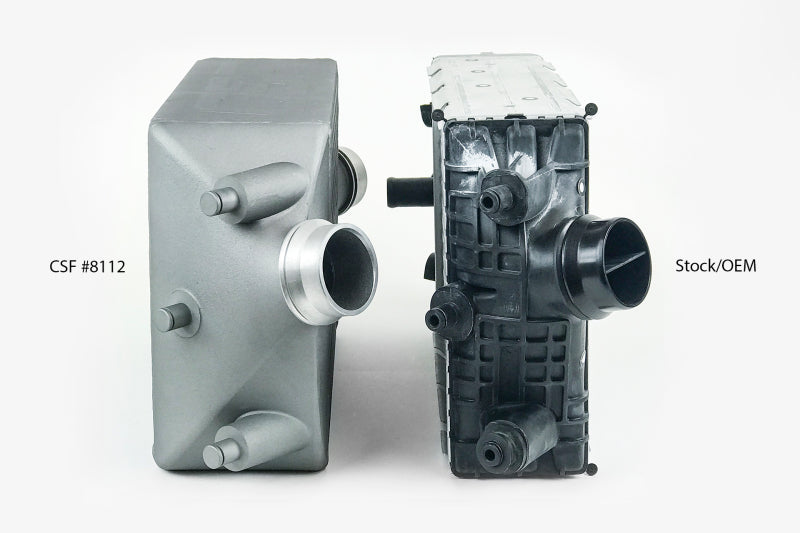 CSF's Porsche 991 Turbo intercoolers have been race-tested, logged, and fully validated by some of the world's best Porsche tuners. These intercoolers have been regarded as the "Go-To" option for the best performance and value available in the performance aftermarket. From first glance the increase in width from the OEM's 80mm core to the CSF's 115mm width is very apparent. Critical for vehicles running performance tunes with bolt-on modifications. Considered a mandatory upgrade for vehicles running upgraded turbo systems. The larger capacity CSF bar/plate core design can handle significantly more airflow + increased boost pressures compared to the OEM intercooler system. CSF's 100% TIG welded cast end tanks, paired with its high-efficiency bar/plate intercooler core. Compared to the OEM style tub/fin core, which is crimped onto the plastic end tanks. The weaker OEM design can crack under high boost or vibrations typical to race conditions. The design of CSF's end tanks allows for airflow to be distributed evenly throughout the entire intercooler compared to the OEM intercooler design which is much shallower. The OEM design makes it more difficult for airflow to reach the top/bottom tube sections at the ends of the intercooler. CSF's Porsche 991 Turbo intercoolers are finished with an aero-space grade, Nano-particle, heat dispersion coating that dissipates heat around 35% better than uncoated raw aluminum. The coating is applied in California, USA by an aerospace coating company who also supplies coatings for Boeing. This unique coating is a key feature to achieving world-record performance, exclusively available from CSF.
