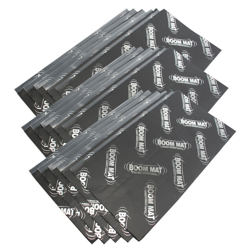 Boom Mat Vibration Damping Material is a premium quality damping material providing extreme noise damping for the most demanding commercial and sound competition applications. Interior panels vibrate and generate noise. Boom Mat stops that noise by trapping it between our thick, 4 mil aluminum stiffening top skin and the asphalt free, pure butyl, noise constraining layer. Plus worry-free no snag adhesion to any interior surface, vertical or overhead, even in the most demanding of temperature extremes. Those quality components are what makes Boom Mat Vibration Damping Material require only 25-50% coverage to get the job done. This saves weight, material cost and installation time. Easy peel plastic release liner (not a paper backing that tears) Enhances stereo performance and sound Gives you a quiet and comfortable interior Minimal prep & install time Performs in extreme temperatures Use as a first layer to control noise and dampen vibrations 15 (fifteen) 12.5in x 24in sheets (30 sq. ft.) 4mm thick